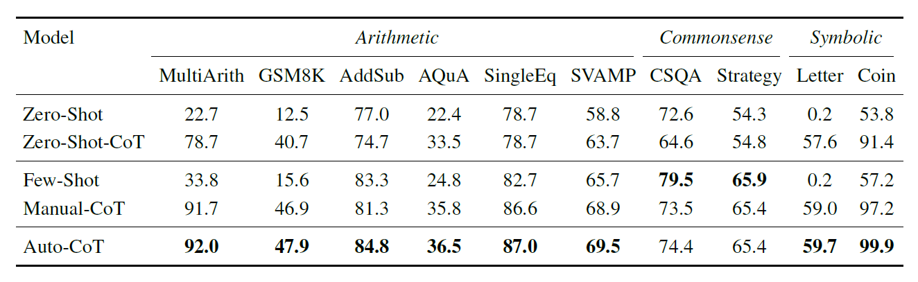 作为对比的方法有Zero-Shot,Zero-Shot-CoT,Few-Shot和Manual-CoT。