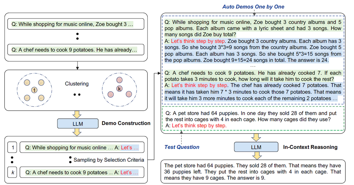 - 抽样:从每个簇中选择一个代表性问题,并使用简单的启发式方法使用Zero-Shot-CoT生成其推理链