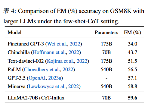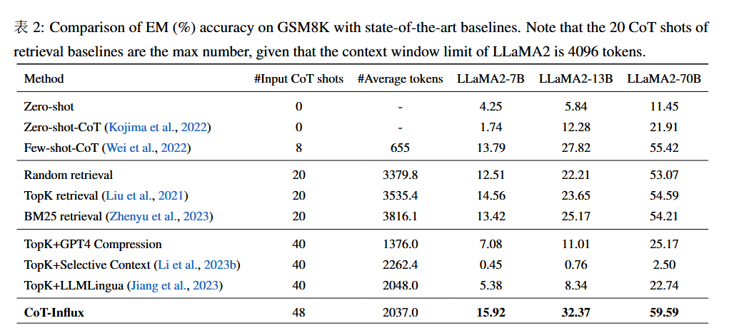 值得注意的是,如下图所示,LLaMA2-70B搭配CoT-Influx在没有任何微调的情况下超过了更大的LLMs。比如LLaMA2-70B相比GPT-3.5提高了2.5%。