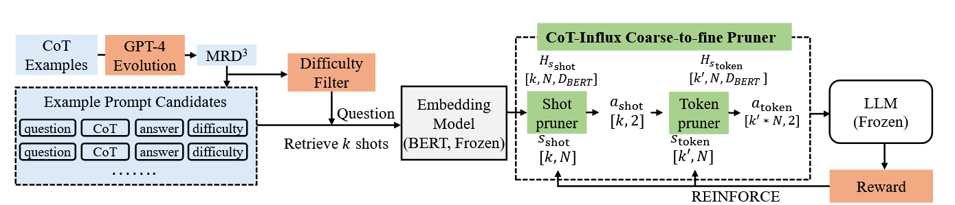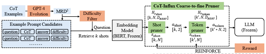 CoT-Influx将LLM视为黑盒,关键模块是一个粗糙到精细的剪枝器,目的在于生成高质量、低长度的CoT示例,包括两个步骤: