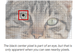 以上图为例,对于单个像素,我们并不知道该像素的意义。但是通过观察该像素周围的像素,我们可以知道该像素来自猫的眼睛。