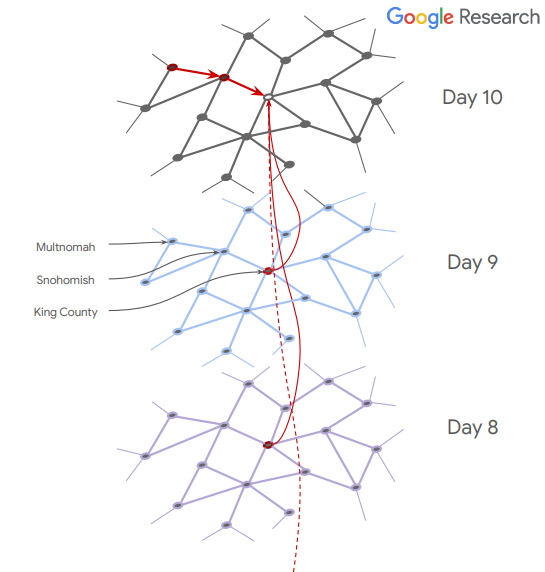 在上面这张图中,每个节点代表一个特定的时间和地点,节点自身的特征为病例数量和内部移动数据。