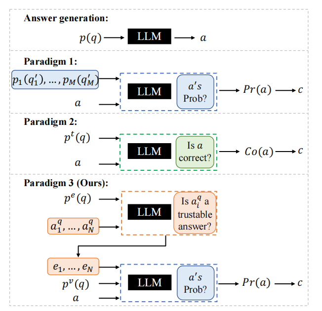 2. 第二种范式(verbalized methods)集中于LLM的自我评估,设计了诸如询问LLM关于答案真实性的指令或思维链(Chain-of-Thought, CoT)推理的方法。