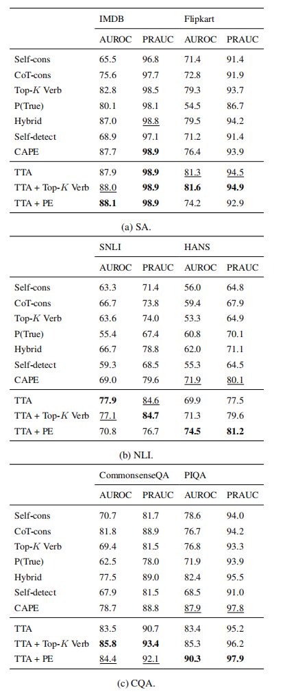 Self-cons、CoT-cons、Top-K Verb、Hybrid、Self-detect、CAPE、P(True)。