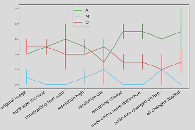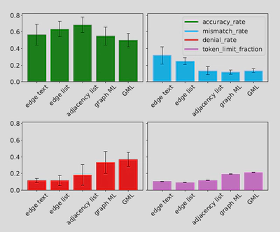 We observe that the “rendering change” offers the highest bump in accuracy, which only goes down when “node size is changed on hop”. This is probably because the LLM is confused bydifferent node sizes and their meaning. This could be resolved by clarifying the text prompt or using different shapes to represent nodes at different hop distances. Based on Figure 11, when “all the changes are applied”, the denial rate is minimum,and the accuracy rate is highest (0.7).