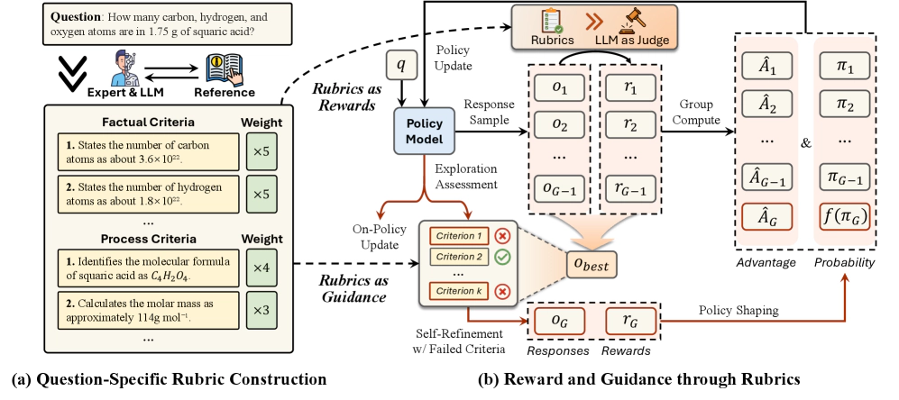 Reinforcement learning (RL) has shown great promise in enhancing LLM reasoning, but current approaches mainly focus on single domains with verifiable rewards. We propose RGR-GRPO, a rubric-driven RL framework for multi-domain reasoning that uses rubrics to provide fine-grained reward signals and offline guidance. This approach helps LLMs receive dense and informative rewards while exploring a larger solution space during GRPO training. Experiments across 14 benchmarks show RGR-GRPO outperforms alternatives, achieving average gains of +7.0%, +5.4%, +8.4%, and +6.6% on math, physics, chemistry, and general reasoning tasks respectively. The method also maintains stable entropy fluctuations during off-policy training and demonstrates stronger pass@k performance, indicating sustained exploration capabilities.