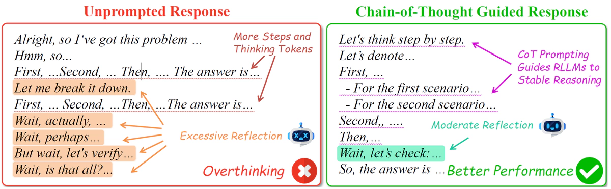 Recent advances in Large Language Models (LLMs) have introduced Reasoning Large Language Models (RLLMs), which employ extended thinking processes with reflection and self-correction capabilities, demonstrating the effectiveness of test-time scaling. RLLMs exhibit innate Chain-of-Thought (CoT) reasoning capability obtained from training, leading to a natural question$:$ “Is CoT prompting, a popular In-Context Learning (ICL) method for chat LLMs, necessary to enhance the reasoning capability of RLLMs?” In this work, we present the first comprehensive analysis of the impacts of Zero-shot CoT and Few-shot CoT on RLLMs across mathematical reasoning tasks. We examine models ranging from 1.5B to 32B parameters, finding that contrary to concerns, CoT prompting significantly enhances RLLMs’ performance in most scenarios. Our results reveal distinct patterns$:$ large-capacity models show minimal improvement on simple tasks but substantial gains on complex problems, while smaller models exhibit the opposite behavior. Further analysis demonstrates that CoT prompting effectively controls the distribution of the numbers of thinking tokens and reasoning steps, reducing excessive reflections by approximately 90% in some cases. Moreover, attention logits analysis reveals the RLLMs’ overfitting to reflection-related words, which is mitigated by external CoT guidance. Notably, our experiments indicate that for RLLMs, one-shot CoT consistently yields superior performance compared to Few-shot CoT approaches. Our findings provide important insights for optimizing RLLMs’ performance through appropriate prompting strategies.