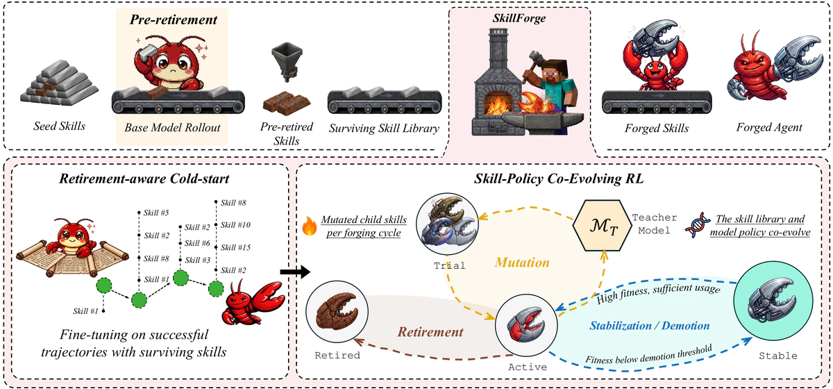 Memory-augmented reinforcement learning strengthens LLM agents’ ability to solve complex long-horizon tasks. Skills are one such form of memory, pairing instructions with an applicability condition over task types. However, retaining every skill indiscriminately as the policy improves lets obsolete or harmful entries accumulate and mislead the agent. We propose SkillForge, an agentic RL method that compiles and evolves the skill library through a fitness-driven skill lifecycle of trial, active, stable, and retired states, so that the skills and the model co-evolve throughout training. A preliminary evaluation phase first uses the base model’s own rollouts to pre-retire low-fitness skills, yielding a filtered library that then seeds supervised fine-tuning. Reinforcement learning takes over from this checkpoint, and at each iteration selective retirement, stabilization, and LLM-guided mutation continue to forge the skill library alongside policy optimization. Across multiple interactive agent benchmarks, SkillForge achieves the highest aggregate success rate, delivering up to 7.8% relative improvement over the strongest baseline while keeping the skill library compact throughout training. We introduce Skillfurnace, a dataset of 5k+ annotated records bundling retirement-filtered SFT trajectories, evolved skill libraries with fitness annotations, and retirement events with human-annotated failure categories to support research on skill quality and lifecycle management.